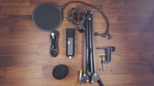 - Packing list: condenser mic, adjustable scissor arm mic arm, metal shock mount, pop filter, foam mic windscreen, table mounting clamp, XLR to 3.5mm cable, and Y adapter